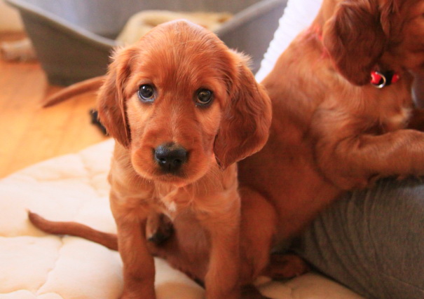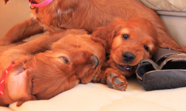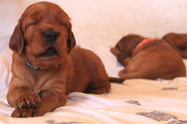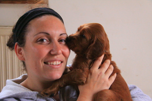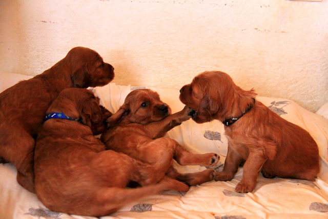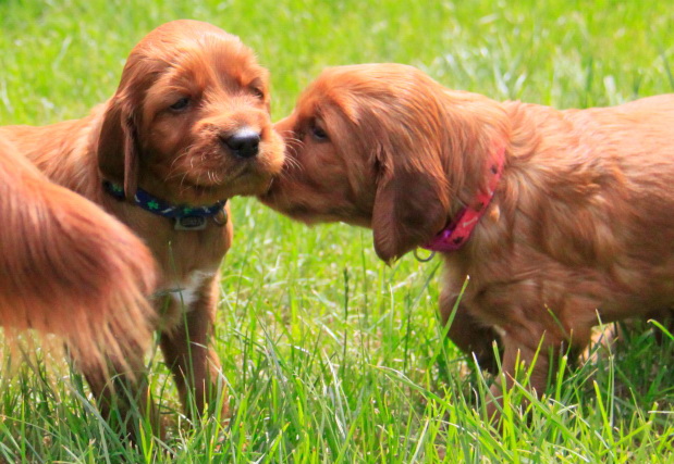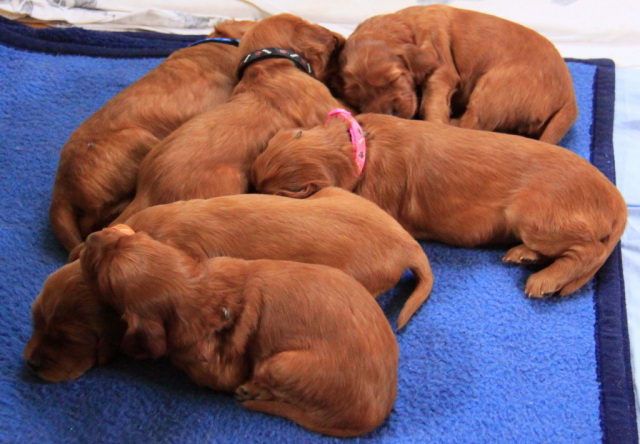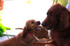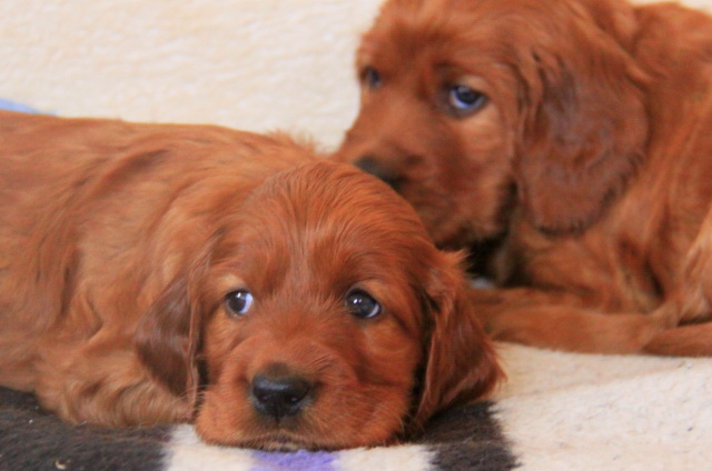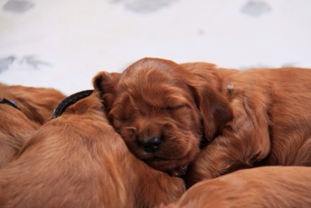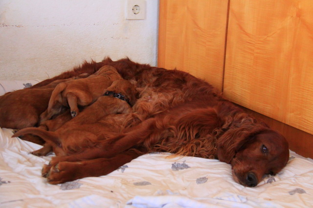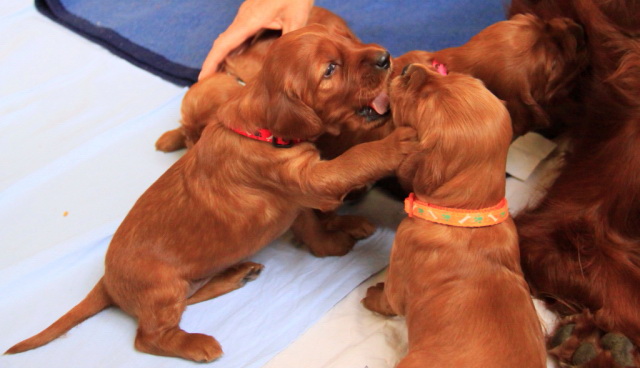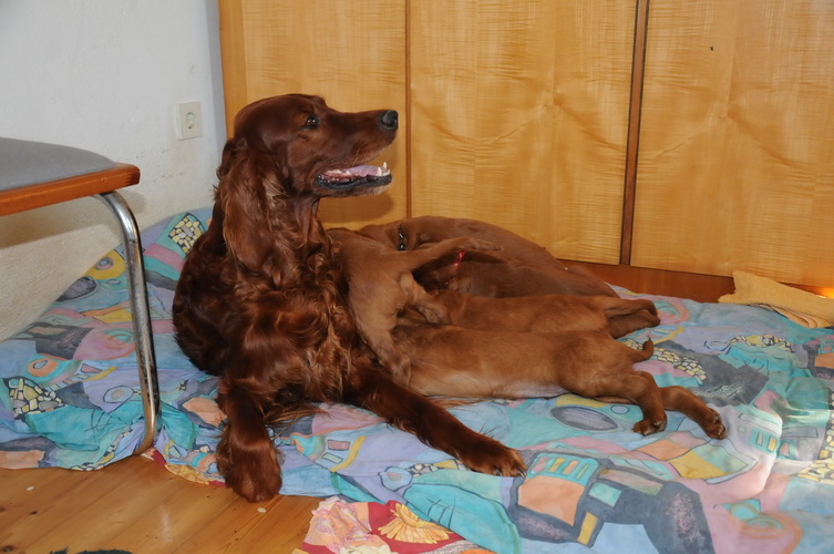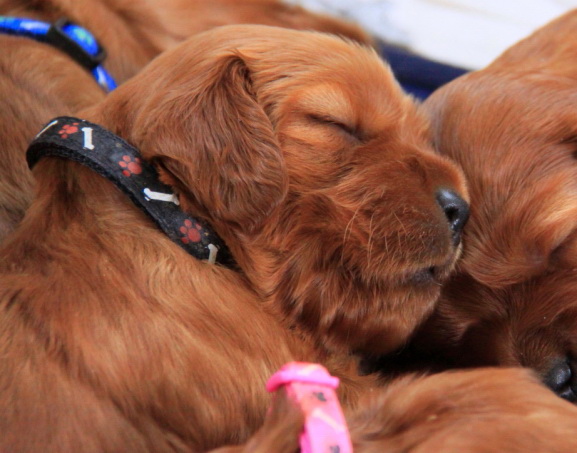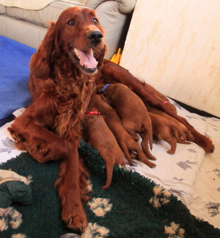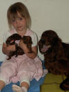 Beide Elterntiere sind HD-frei, Clad-frei, PRA rcd-4 frei, haben auf Ausstellungen vorzügliche Bewertungen erhalten und sind voll integrierte Familienmitglieder. Sie sind geduldig mit Kindern und freundlich zu allen Menschen und Hunden.